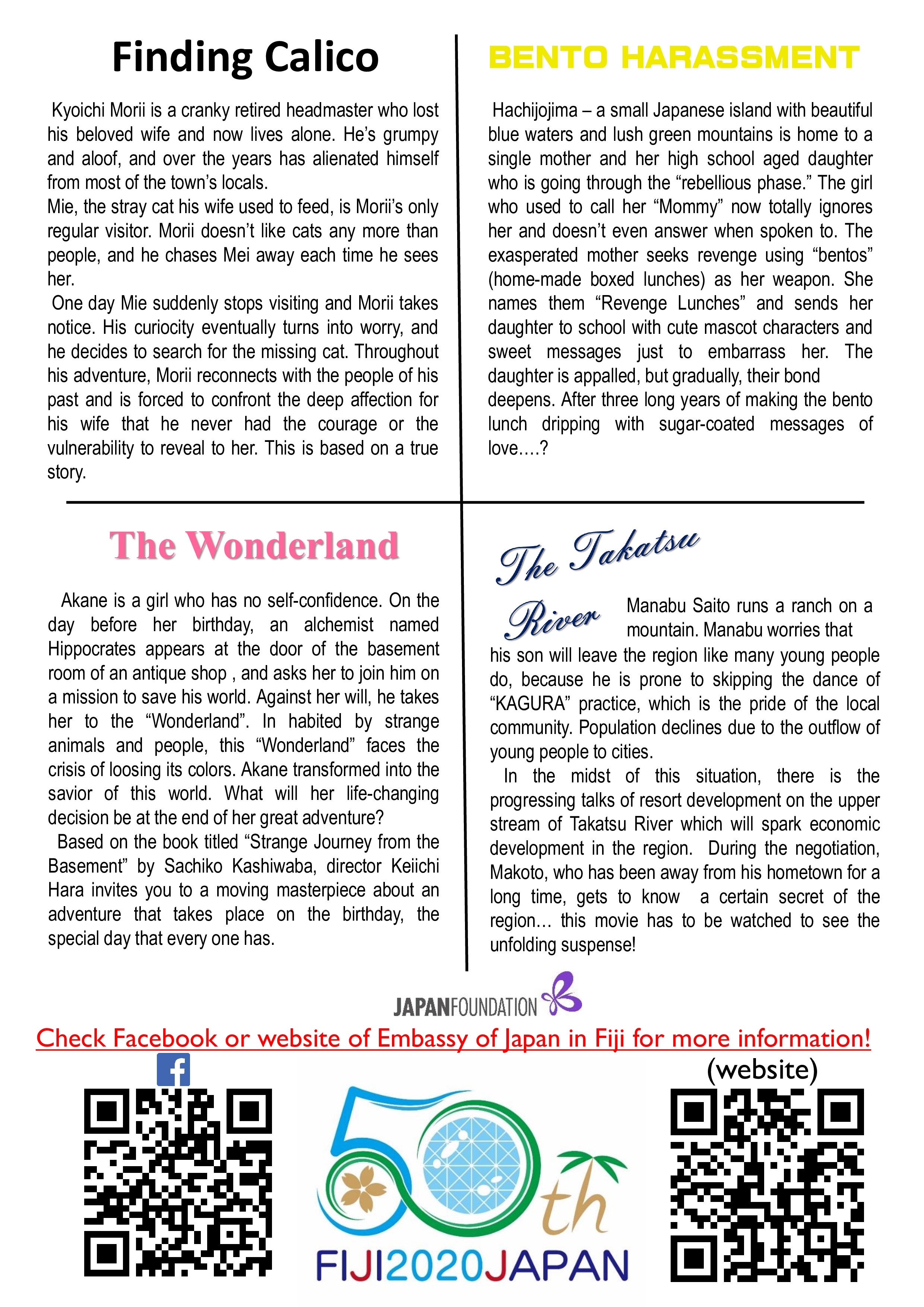 この度大使館では日本文化紹介事業として詳細以下のとおり日本映画上映祭(Japan Film Festival)を開催致します。映画館内では、浴衣・習字・折り紙体験等ができる文化体験ブースも設ける予定です。お誘い合わせのうえご参加いただきますよう何卒よろしくお願い申し上げます(参加費無料)。