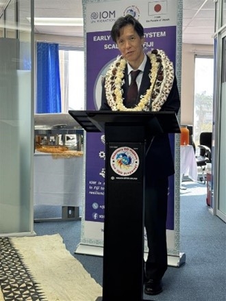 この支援は、IOMが実施する「太平洋地域における早期警報システムの強化計画」の一環であり、フィジー、パプアニューギニア、バヌアツの各国政府を対象とした地域プロジェクトです。2023年初頭、フィジーはサイクロン・ジュディおよびケビンによって甚大な被害を受け、約20万人(人口の約5分の1)が影響を受けました。重要インフラの損壊や生活基盤の混乱など、気候変動に起因する災害への脆弱性が改めて浮き彫りとなりました。