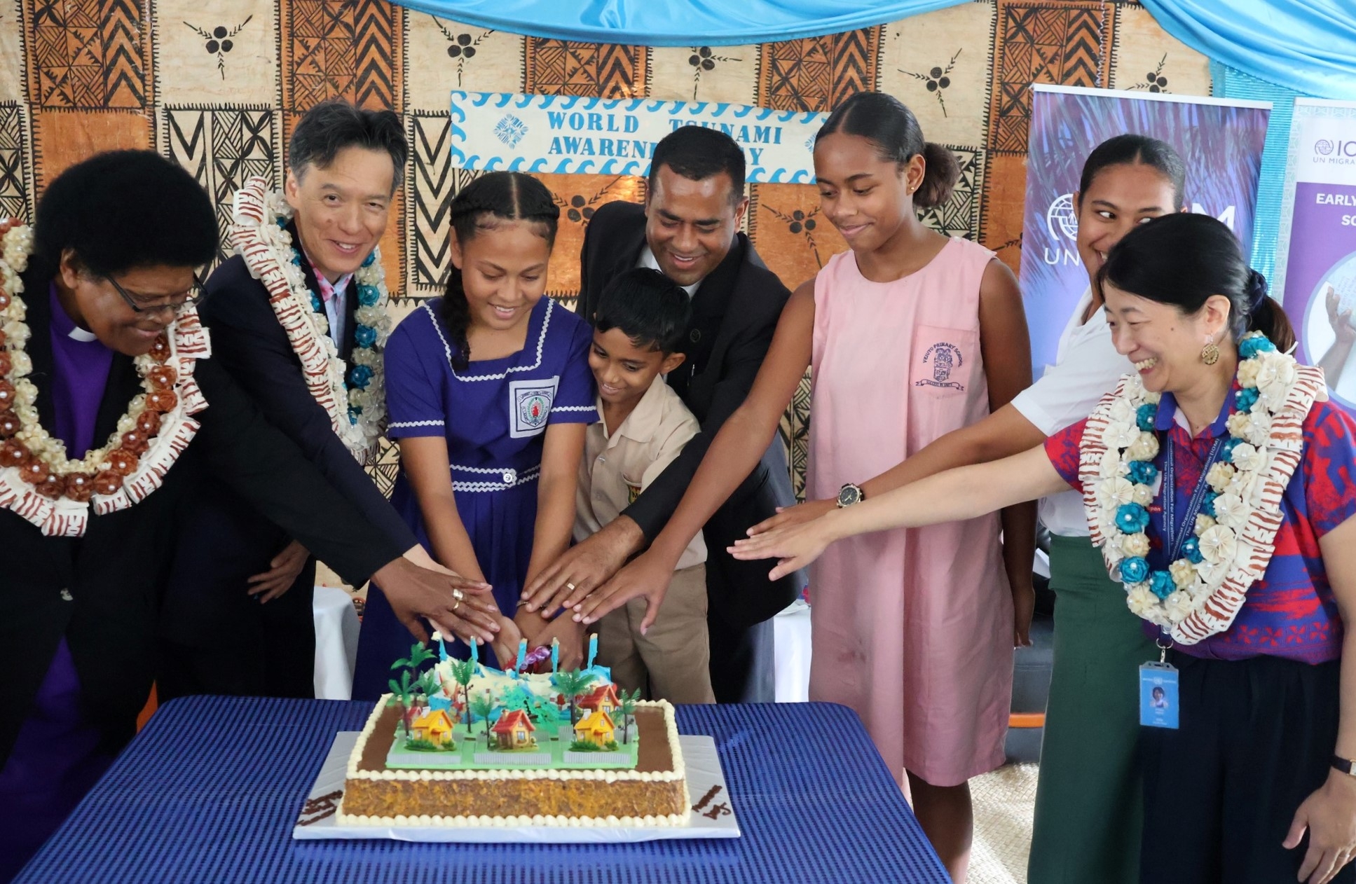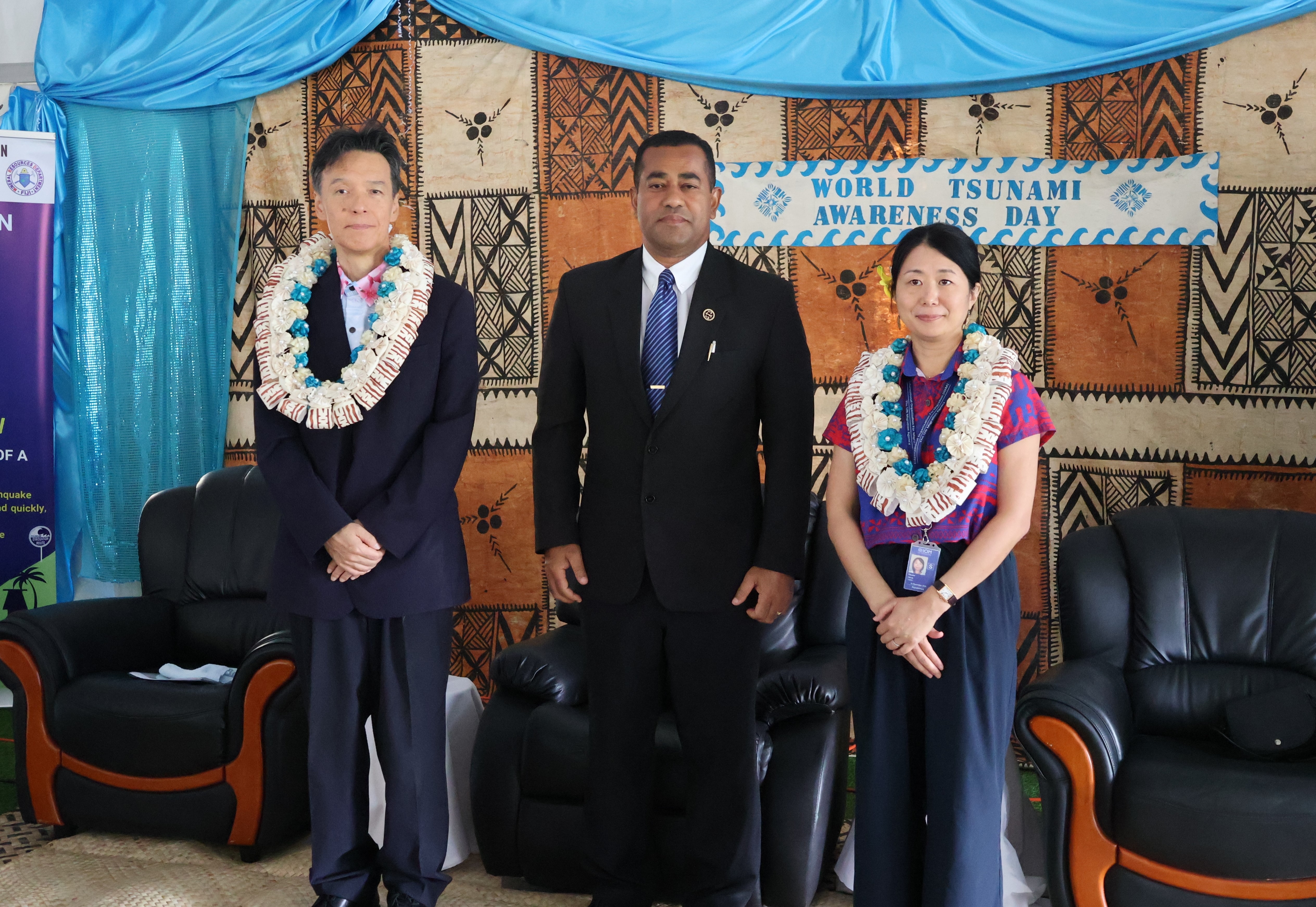 令和7年11月5日、道井緑一郎駐フィジー日本大使は、フィジー政府鉱物資源局において開催された「世界津波の日」記念イベントに出席しました。このイベントは、フィリモニ・ヴォサロンゴ土地・天然資源大臣が主催し、津波防災意識向上プログラムの開始についての発表も同時に行われました。このプログラムは、日本政府が提供した資金によって国際移住機関(IOM)が実施するもので、11月5日のイベントには、IOMを代表してフィジー事務所より井上悦子プロジェクト開発担当官が出席しました。イベントでは、「津波に備えよ:津波への備えに投資せよ」というテーマの弁論大会が行われ、スバ周辺の小中学校10校の児童、生徒が参加しました。
