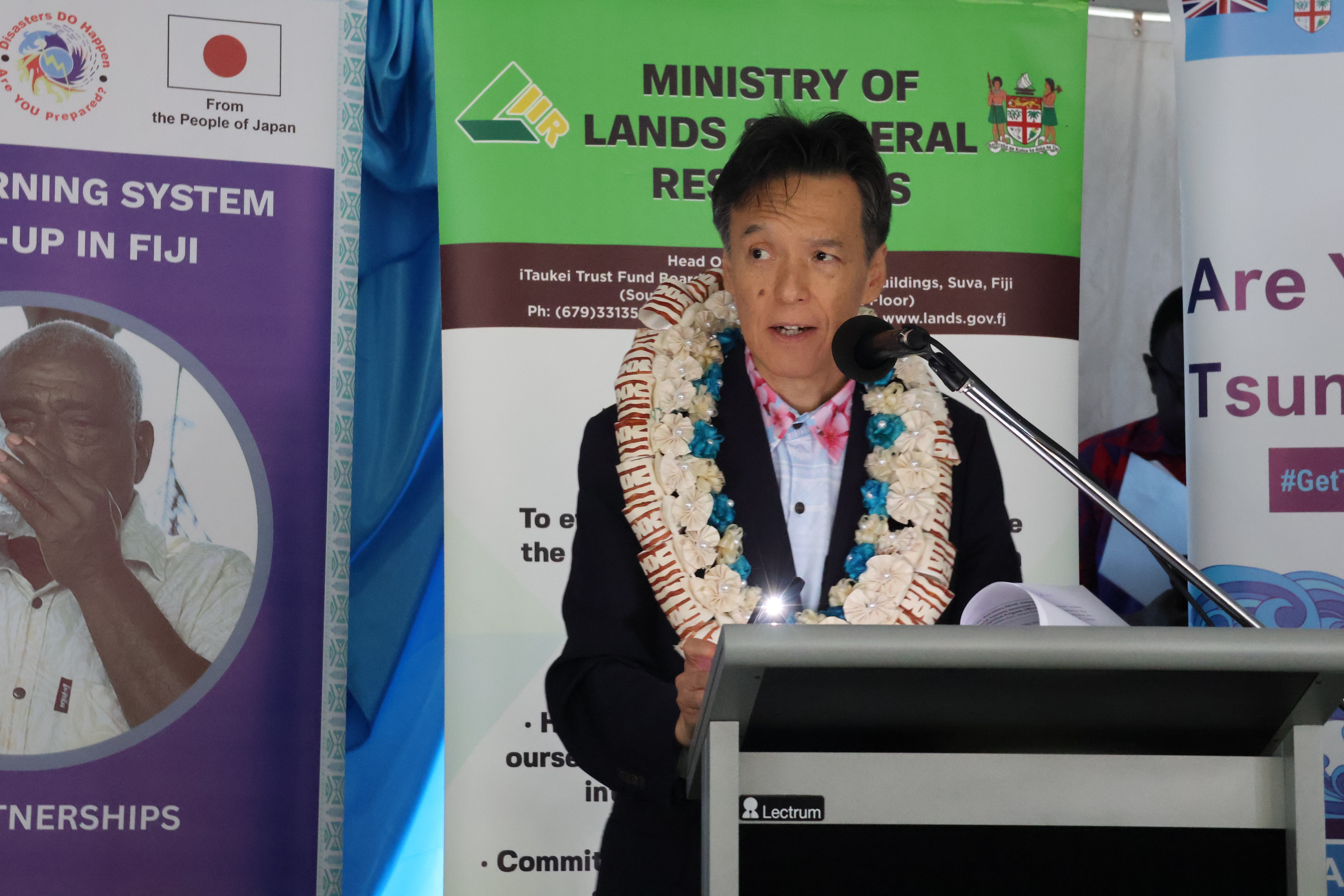 道井大使は式辞の中で、東日本大震災の教訓と強靭性の遺産について振り返り、防災と教育の重要性を強調し、フィジーだけでなく太平洋地域全体における災害へのレジリエンス強化への日本の揺るぎない支援のコミットメントを再確認するとともに、「太平洋諸国の一員として、フィジーと日本は相互尊重と協力に根ざした深い友情の絆を共有しています。このパートナーシップは、学び合いと共同行動の促進を促し続けています。知識の交換、それぞれの経験の共有、そしてあらゆる世代が将来の課題に備えられる未来を築くために、引き続き尽力してまいりましょう。」と述べました。